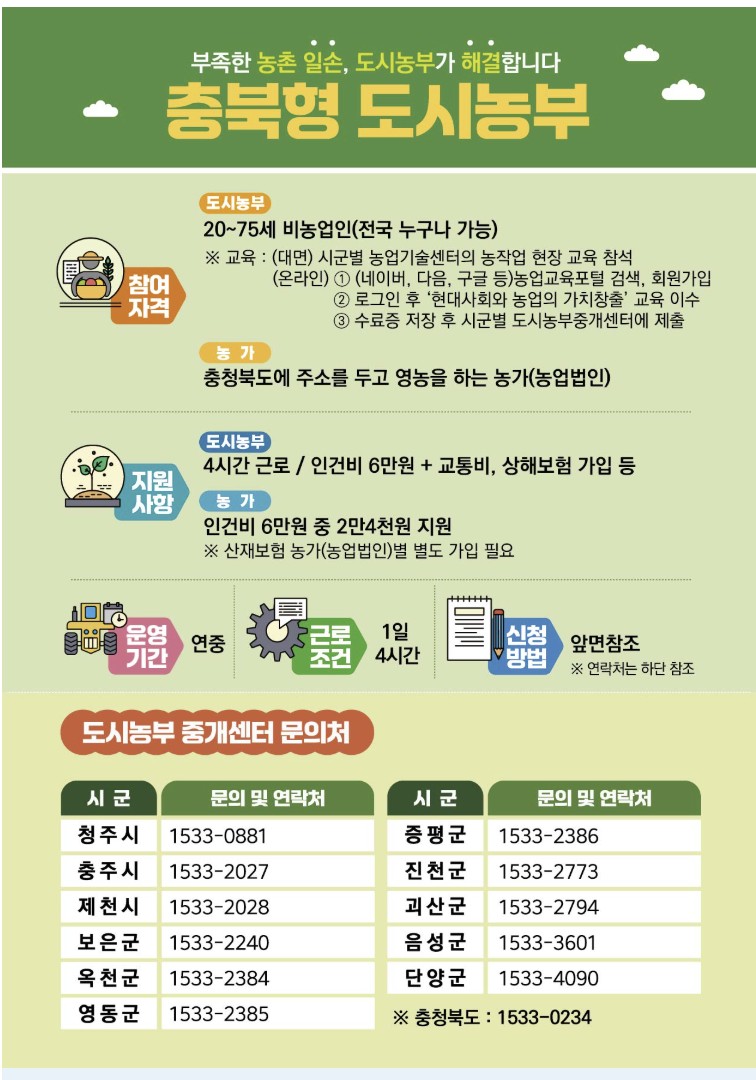 중장년층 도시농부 제도는 충청북도가 주관하여 도시 거주 중장년층이 농번기 농가에 참여해 농작업을 돕고, 그에 따른 수당을 지급받는 공공 일자리 지원 사업입니다. 2026년 기준 해당 제도는 단기 일자리 성격이 강해 정규직 취업이 부담스러운 분들도 비교적 쉽게 참여할 수 있도록 설계되어 있습니다.
